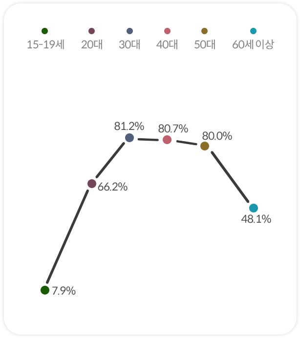 15~19세:7.9%, 20대:66.2%, 30대:81.2%, 40대:80.7%, 50대:80.0%, 60세이상:48.1%