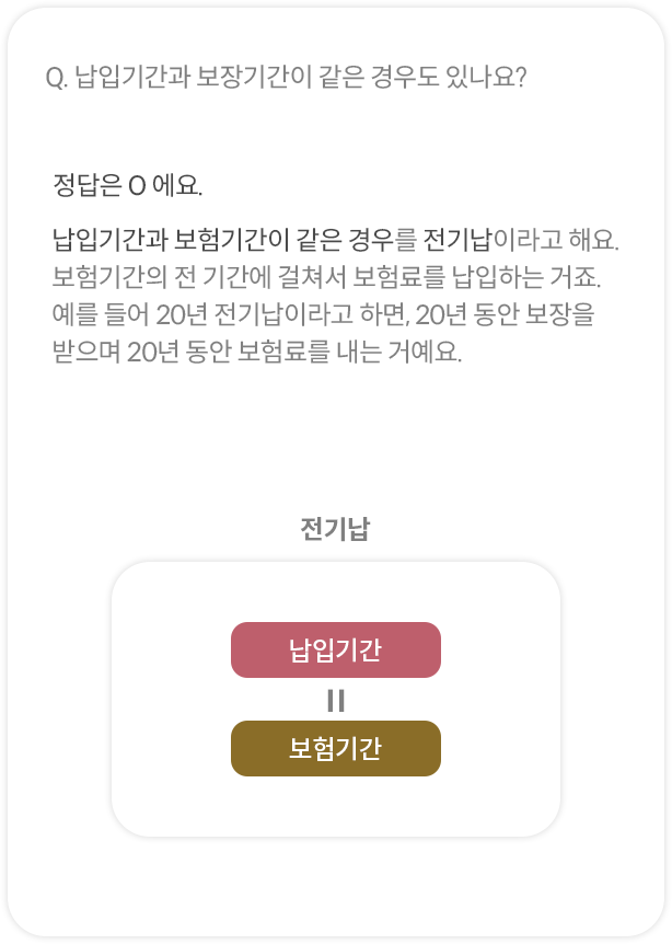 정답은 O 에요. 납입기간과 보험기간이 같은 경우를 전기납이라고 해요. 보험기간의 전 기간에 걸쳐서 보험료를 납입하는 거죠. 예를 들어 20년 전기납이라고 하면, 20년 동안 보장을 받으며 20년 동안 보험료를 내는 거예요.